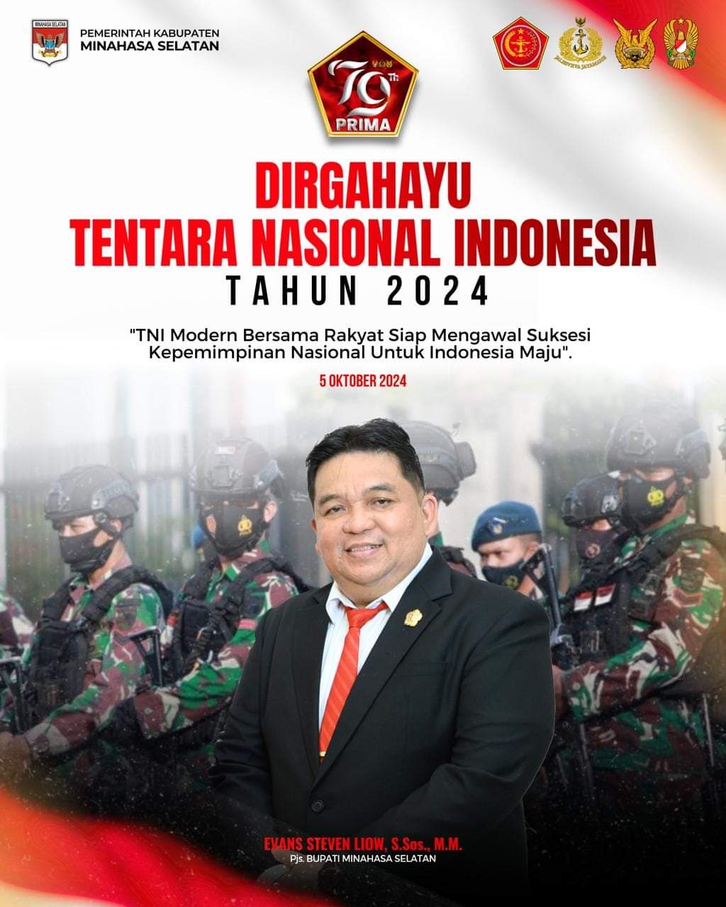 MANADO, nyiurmedia.id/ – Pjs. Bupati Minahasa Selatan, Bpk. Evans Steven Liow, S.Sos., MM., menghadiri Upacara Peringatan Hari Ulang Tahun Ke-79 Tentara Nasional Indonesia (TNI) Tahun 2024.