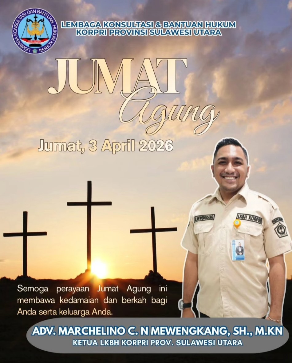 MANADO, NyiurMedia.id – Momentum Jumat Agung dimaknai sebagai ruang refleksi spiritual yang sarat makna pengorbanan dan kasih. Ketua LKBH KORPRI Provinsi Sulawesi Utara, Marchelino C.N. Mewengkang, menyampaikan harapannya agar peringatan ini membawa kedamaian bagi seluruh umat Kristiani, sekaligus memperkuat nilai kemanusiaan dalam kehidupan bermasyarakat. “Semoga perayaan Jumat Agung ini membawa kedamaian dan berkah bagi Anda serta keluarga,” ujarnya, menegaskan pentingnya menjadikan nilai spiritual sebagai pijakan dalam bertindak.